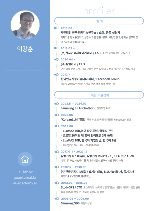 언어모델 솔루션 및 맞춤형 파인튜닝 서비스를 제공하는 전문 기업으로, AI 기술을 기업 맞춤형으로 적용하는 혁신적 접근을 주도. - 한국인공지능커뮤니티 리더